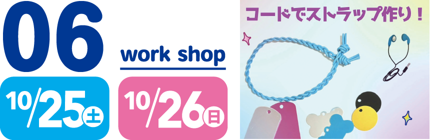 ジャンクのイヤホンケーブルを編み、ナットやビーズなど多彩なパーツの中から、 お好みのものを選び、オリジナルのストラップを作れます。 さらに、金属プレートにイニシャル等お好きな文字を刻印することも出来ます。 ※兄弟・姉妹で参加される(複数名で申込)場合は、対象年齢以下のお子様の参加も可能です。
