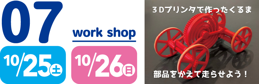 3Dプリンターを活用して、考える力を養うワークショップです。 大きさや形が異なる部品を組み合わせて、試行錯誤しながらうまく走る車を考えてもらいます。 また、3Dプリンターを用いてモノづくりの可能性が広がることを学びます。 ※兄弟・姉妹で参加される(複数名で申込)場合は、対象年齢以下のお子様の参加も可能です。