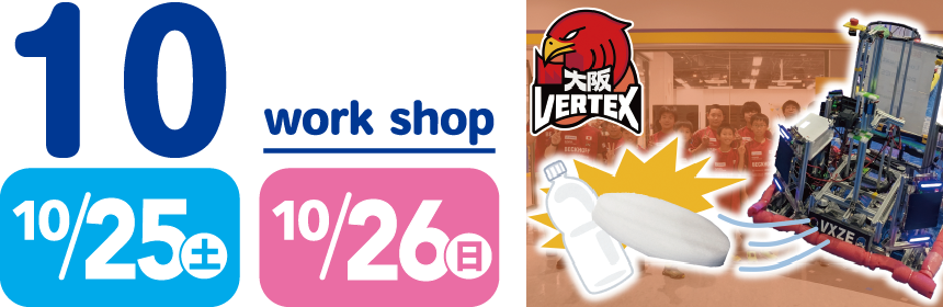 ロボットに取り付けられたカメラ映像を見ながら一人称視点で操縦し、 ロボットが発射するフリスビーで的を倒そう! 操縦するロボットはジュニアロボットチームの大阪ヴェルテックスに所属する 小中学生が製作したものです。 また、実際にロボット製作する様子もご覧いただけます。