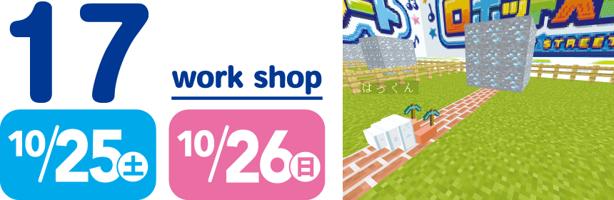マインクラフト®の世界に生息するプログラミング言語を話す生き物”はっくん”に いろんな命令を吹き込んで楽しみながらプログラミングにチャレンジしてみよう! 建物を建てたり、畑を耕したりプログラミング次第でできることは無限大! ※兄弟・姉妹で参加される(複数名で申込)場合は、対象年齢以下のお子様の参加も可能です。